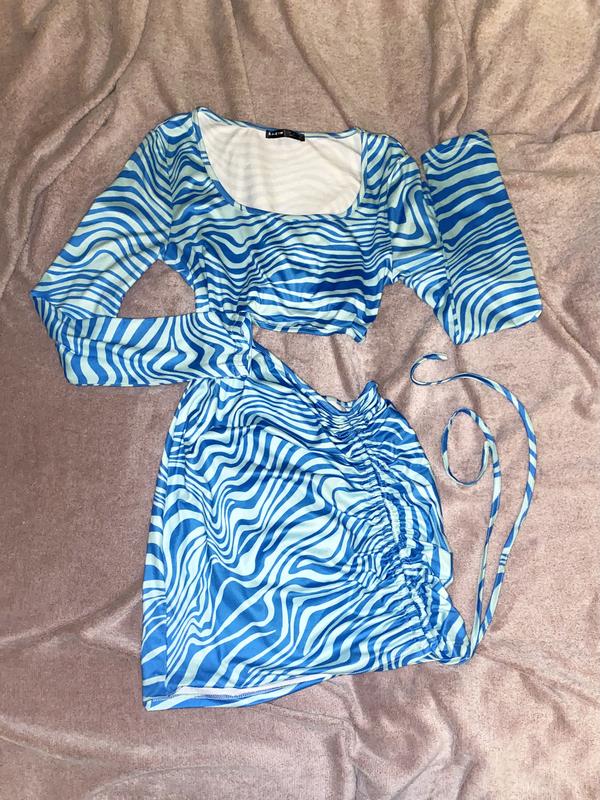 Розмір S-М Асиметрична міні сукня з завʼязками на юбці для регулювання висоти, круглий виріз, довгий рукав, принт смужка, колір голубий, дефектів не помітила