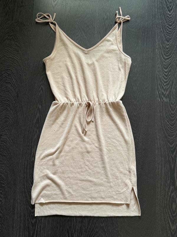 Легка трикотажна сукня ніжного персикового кольору. Має регульовані бретелі на зав’язках, еластичну талію зі шнурком і невеликі розрізи знизу для зручності. Приємна до тіла тканина, ідеальний стан без дефектів. Підходить для літа, відпочинку або як пляжний варіант. Склад: 85% поліестер, 15% бавовна