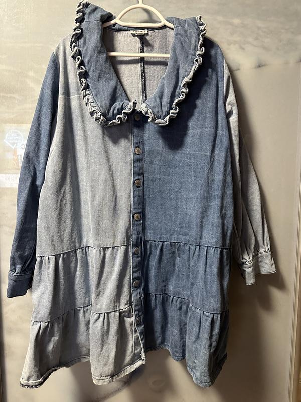 Дуже стильна джинсова сукня з комбінованих тканин оверсайз крою. Розмір вказано L, сидить вільно Стан чудовий, без дефектів