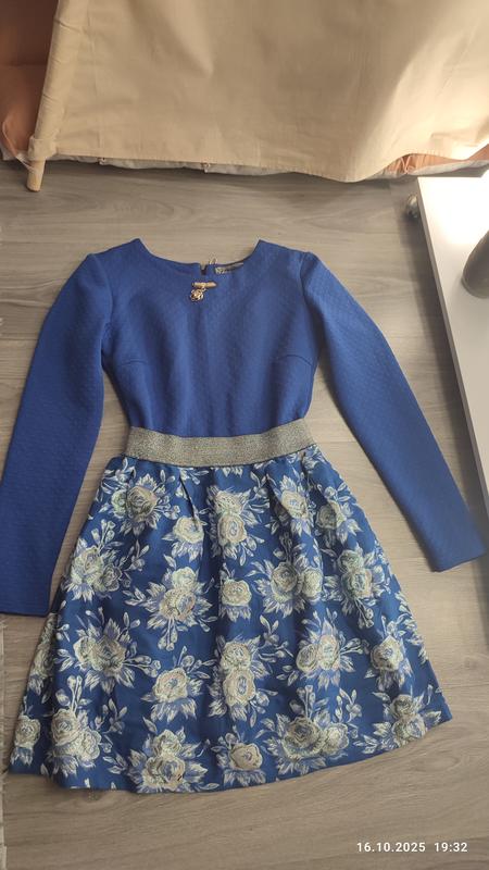 Платье женское с длинным рукавом синего цвета, снизу принт цветы сзади имеет замочек,