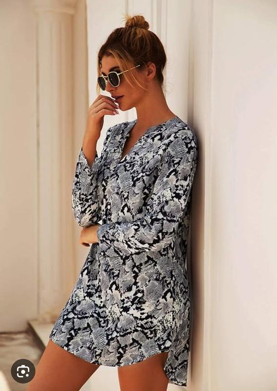 Свободное платье-туника с V-образным вырезом и длинными рукавами, которые можно сделать три четверти. Платье красиво смотрится под пояс.
