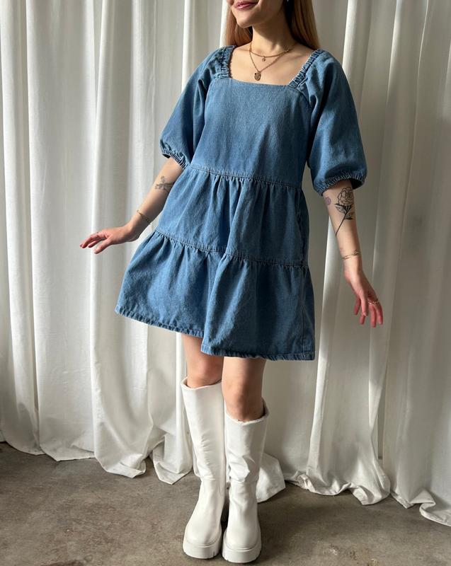 Новое джинсовое ярусное платье с квадратным вырезом и рукавами буфами. Цвет - голубой. Красивая, стильная, оригинальная, фирменная и качественная. Замеры: ПОГ 57 ПОТ 53 в бедрах свободное длина 94 Производитель Пакистан