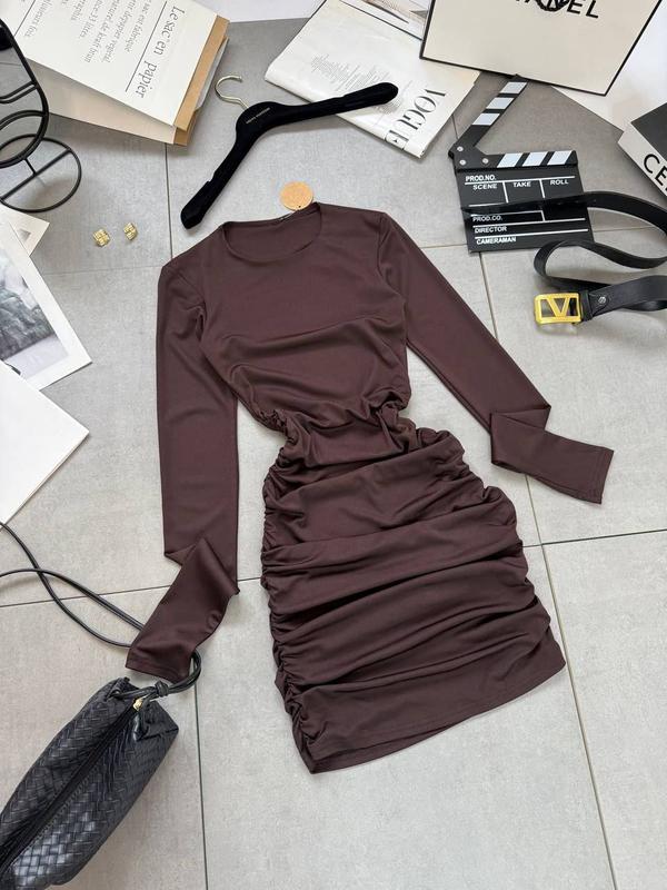 Платье мини короткая женская со сборкой с длинными рукавами базовая коричневая шоколад чер...
