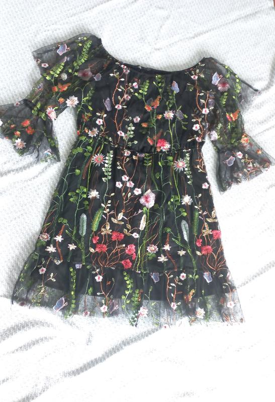 Платье с цветочным принтом на сетке, с открытыми печами,рукав до локтя, в талии на резинке. Замеры выполнены по изделию: ОГ 90см ОТ 84см+тянется ОБ 106 Длж.низу от талии 53см Долж.суни от верха 80см (платье до колена)