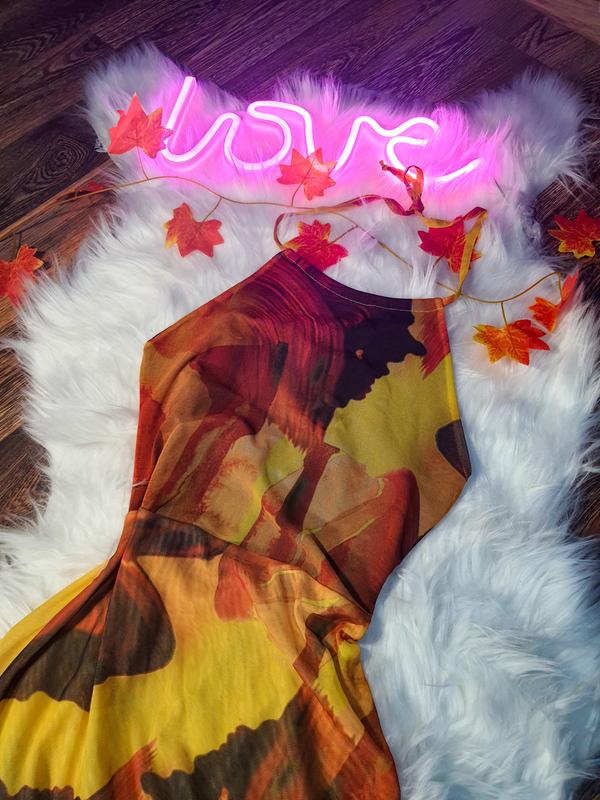Яркая мини-платье на подкладке, с завязками на шее. Выгодно подчеркнет вашу фигуру. Имеет двойную юбку. Размер-XS-S ОГ 70-85 ОТ 56-66 ОС 80-91