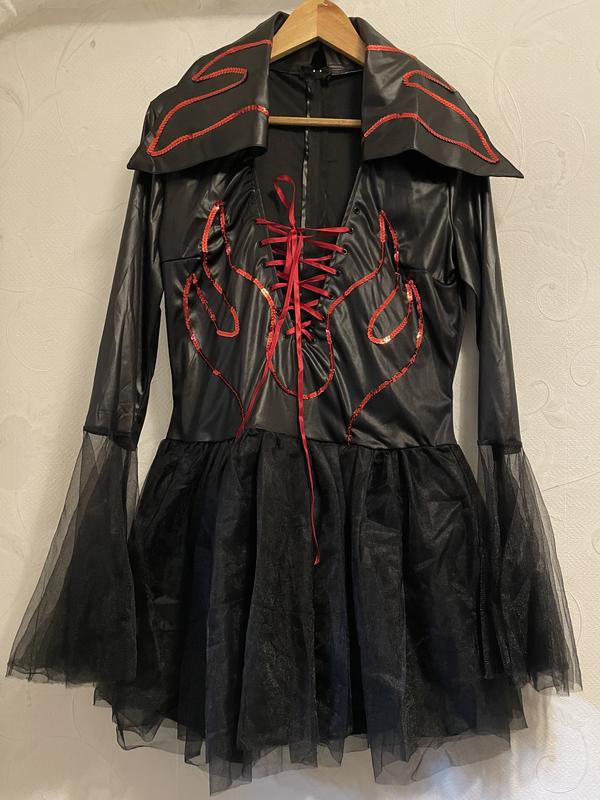 Ефектний образ для Хелловіну, тематичної вечірки чи фотосесії. Розмір: XL (CLASSIFIED) Заміри: • ПОГ: 54 см • ПОТ: 42 см • Плечі: 43 см • Рукав: 71 см • Довжина: 83 см Ідеально підійде як основа костюма демониці, відьми або темної королеви. Лише сукня — без аксесуарів. Верх виконаний із приємної тканини, спідниця має об’ємну фатинову вставку, а рукави з легкого шифону. Комір можна носити як опущеним, так і піднятим для більш виразного вигляду.