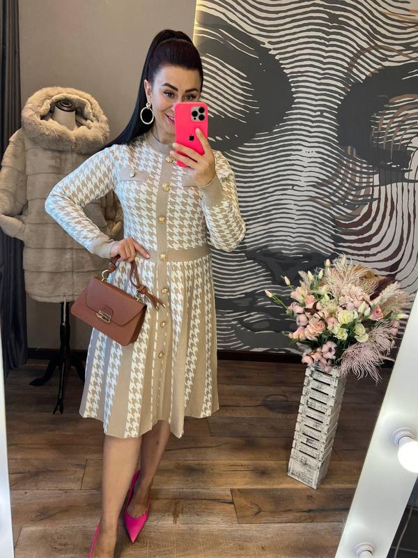 Осветляющая КРАССИВАЯ СУКНЯЯ ПРИТАЛЕНОГО СИЛУЕТУ ВИКОНАНА С КАЧЕСТВЕННОГО ТРИКОТАЖА МАШИННОЙ ВЯЗКИ ИЗ ЭФФЕКТНЫМ ПРИНТОМ, УКРАШЕННАЯ УШИТЬ В СОЛОТИСТИМЫ ГУДЗЫКИ ДОВЖЕННАЯ РУКАВА ОТ ШИИ 75 СМ ДОВЖИНА ВИРОБУ 100 СМ РАЗМЕР ЕДИНЫЙ 46-48 КОД 0410