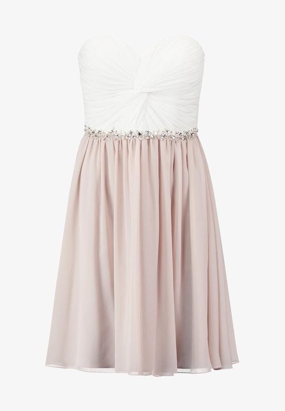 коктейльна сукня з білим ліфом і спідницею персикового кольору, прикрашена стразами на талії.
