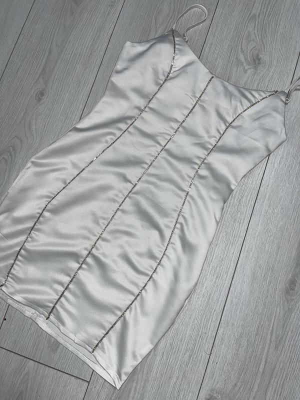 Елегантна сатинова сукня на тонких бретелях. М’який блиск тканини красиво підкреслює фігуру, а декоративні блискітки вздовж швів додають вишуканості. Ідеальний варіант для вечірки або святкового виходу.