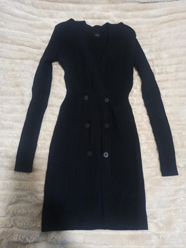 Черное платье мини на пуговицах в рубчик с длинным рукавом и подплечниками