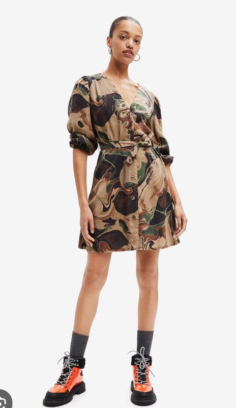 Платье укороченное, застежка на пуговицах, есть поясок. Изготовлена из лиоцелла, экологичной вискозы. Указан размер S. Длина 84, ПОГ 44, ПОТ 38, ПОБ 49. Рукав от плеча 51 см.