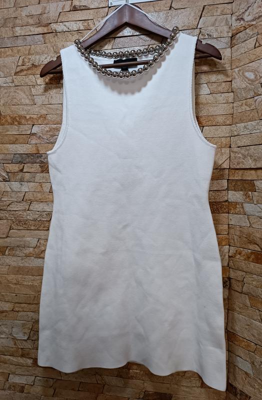 Классное трикотажное платье с круглым воротником и наконечниками Zara. Трикотаж плотный, держит форму. Стан идеален. На сайте это платье имеет насестины еще и на пройме, но пришло без наметин, только на шее. Так как платье белого цвета, то нуждается в стирке. В цене учтены. Замеры: Длина платья - 81 см.