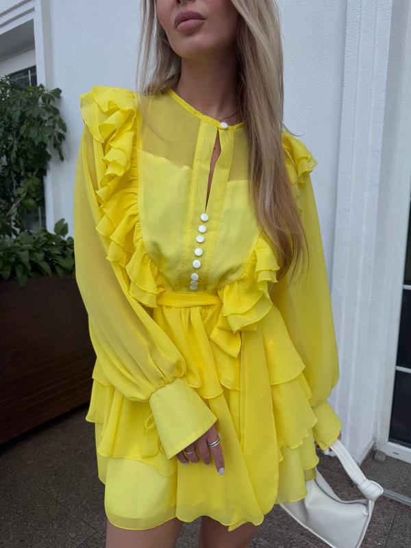 Сукня "Фея" ✅тканина - шифон високої якості, бавовняний підклад ✅опис моделі - сукня складається з декількох шарів спідниці з воланами, на декоративних гудзиках, з розрізом. Рукав довгий, з легким об’ємом, манжет на завʼязках. Пасок у комплекті ✅розмір універсальний 42-46 3300 (✔️ на замовлення можна 40 46 48 50 52 розміру, чекати 2-6 робочих днів, +300) Заміри сукні "Фея" Розмір універсальний 42-46 Довжина сукні по спинці - 80 см Довжина рукава з манжетом - 62 см Манжет - 9 см Плече - 12 см Обсяг грудей до 91 см Обсяг талії до 80 см Обсяг стегон до 100 см