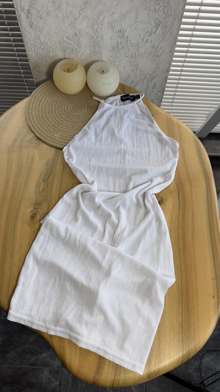 Біла сукня в рубчик з круговою застібкою біля шиї