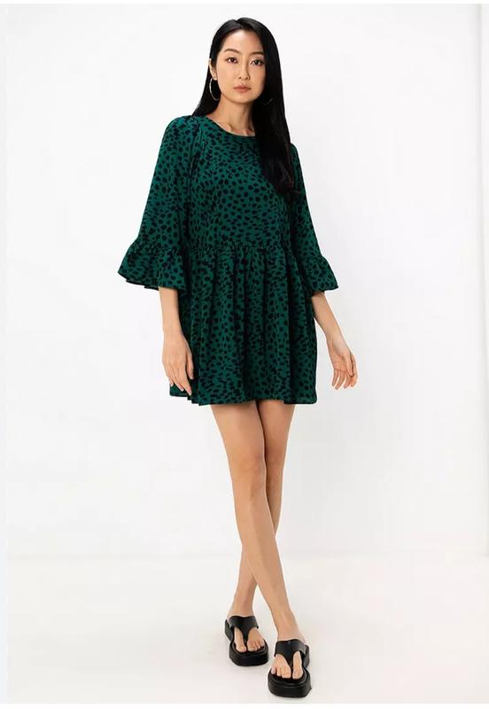 В идеальном состоянии. Красивое свободное пятнистое платье. Тканина легка, не тягнеться. Размер 12/40/L, но смотрите по замерам папа Замеры (полуобхват): Груди 60 Талия 50 Бедра - свободно Рукав 51 Длина от плеча 83