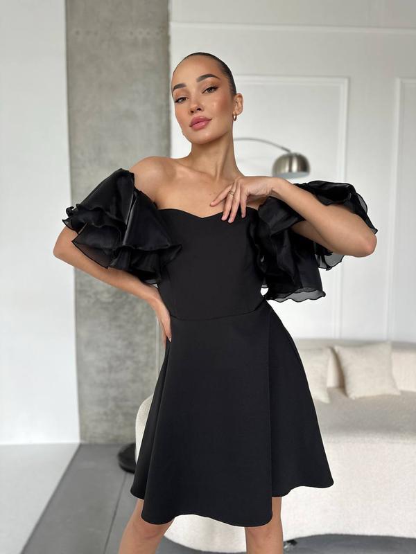 🔥Фото реал🔥 Новинка сезону! 🖤🤍🖤 Сукня 💎Модель 451 ⚜️Размеры: 42-44, 44-46 ⚜️Тканина: костюмка + органза ⚜️Цвет: черный • Рукава: прикрепленные резинкой Топ качество ❤️🔥 Размер С: ОГ 84-86 ОТ 66-68 ОБ 92-96 Размер М: ОГ 87-90 ОТ 69-72 ОС 96-100 • Длина изделия по спинке: 70 см • Длина юбки от талии: 48 см • Длина волана: 20 см Непревзойденная элегантность и стиль в каждом элементе!