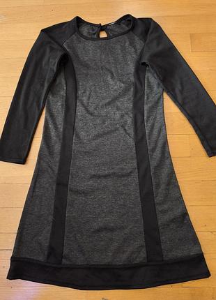 Це приталена сукня, чорні полоси підкреслюють фігуру, виглядає жіночно, але в одночас стримано. Добре підійде для школи. Десь на 12-13р. Груди 35 Рукав реглан 55 Довжина 78