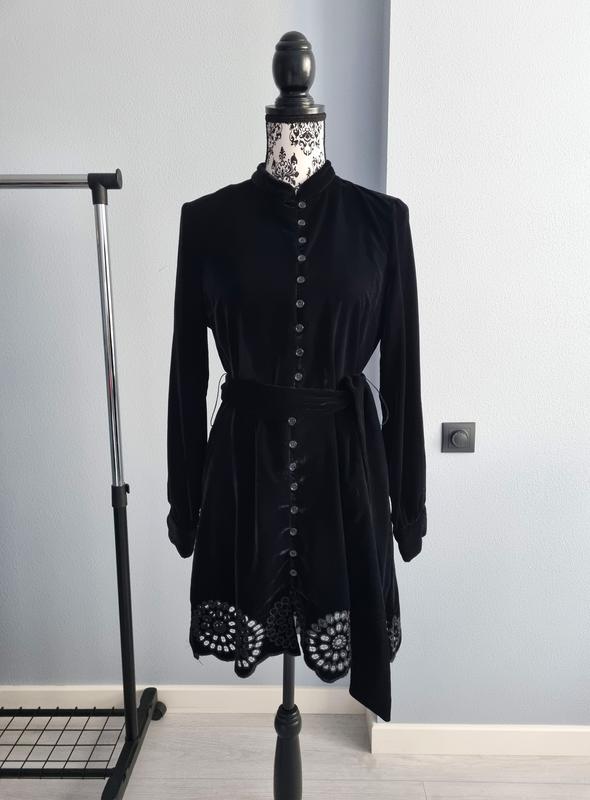 Платье бархатное с перфарированным подолом. Застегивается на маленькие пуговицы. Пояс в комплекті. Бирка со складом ткани, к сожалению, срезана. Рекомендую на рост +/-170. Замеры: полуобхват груди - 48.5 см полу охват талии - 40 см полуобхват бедер - 51 см длина - 85 см длина от плеча до линии талии - 40 см рукав - 60 см