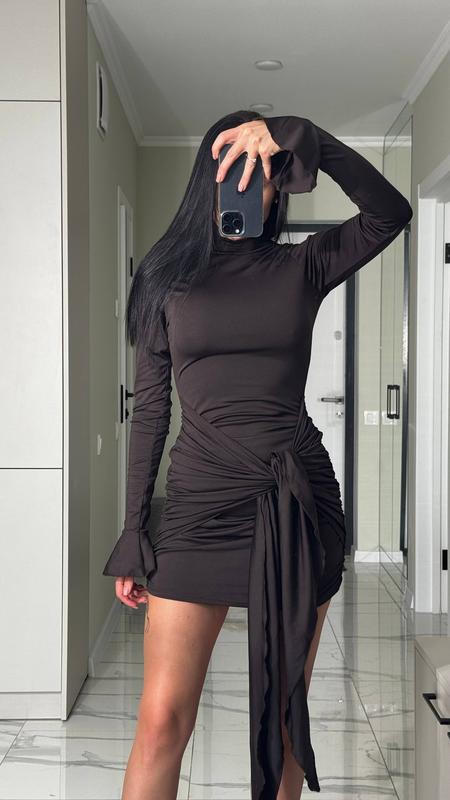 Шоколадное приталенное короткое платье с акцентной драпировкой с завязкой