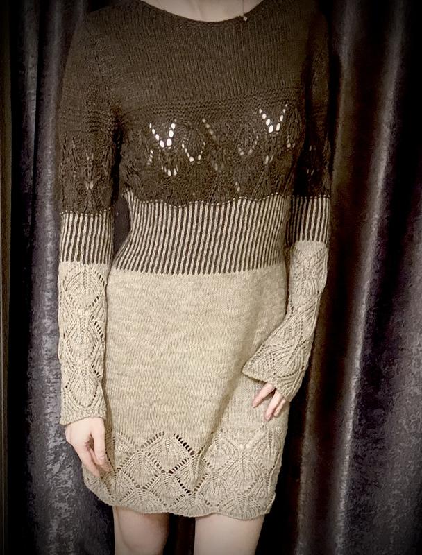В’язана сукня ручної роботи ✨ Стильна в’язана сукня у двох тонах — темно-коричневому та бежевому. 🔸 М’яка пряжа (вовна + акрил ) приємна до тіла, не колеться. 🔸 Оригінальний візерунок із ажурними вставками на грудях і рукавах. 🔸 Подовжені рукави з ефектним поєднанням різних текстур. 🔸 Вільний крій, зручна горловина човником. 🔸 Ідеально підходить для осені та зими — тепла, але дихаюча. 📏 Розмір: oversize (підійде на S–M, можливо й L) 📐 Довжина: вище коліна / до колін (залежить від зросту, на фото людина зростом 175 см) 🎨 Колір: коричнево-бежевий меланж 🧵 Матеріал: вовна з акрилом (сумішова пряжа) Заміри напишу за запитом Без дефектів, ідеальний стан