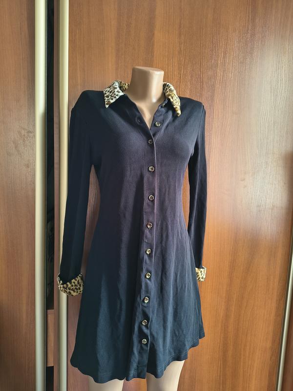 Платье-рубашка с леопардовыми акцентами Стильное черное платье на пуговицах с длинным рукавом. Воротник и манжеты с леопардовым принтом добавляют оригинальности - выглядит очень эффектно и подходит и для повседневных образов, и для выхода.Стан идеальный цвет не выгорает, а на фото так падает свет