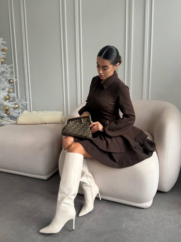 Модель 887 Женское платье с воланами Размерный ряд S,M,L,XL Ткань костюмка высокого качества Цвета черный, молоко, беж, красный и шоколад Модель на пуговицах, с двойным воланом Можно надевать под разную обувь и разный пасочек Супер качество