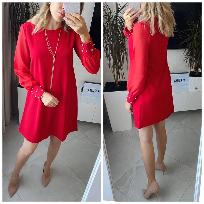 Платье Модель 1518 Ціна 650 Розмір 42-46 Довжина 88см, рукав 61см Модель 1518 Ціна 700 Розмір 48-50 и 52-54 Довжина 97см, рукав 61см Тканина турецький креп-дайвинг, рукава легкий шифон Манжети прикрашені прибитими намистинками Колір чорний та червоний Кар