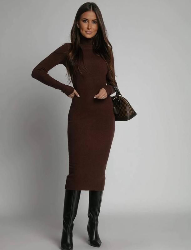 Сукня №797 42-44,46-48 Колір шоколад, чорний Тканина турецький рубчик Ця елегантна сукня міді з турецького рубчика – правильний вибір для тих, хто цінує поєднання стилю та комфорту. Суворий силует з довгими рукавами та коміром гольф ідеально підходить як для базового, так і для святкового гардеробу