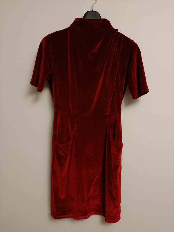 Цвет Красный (Усиленный бордовый/винный бархат) Тканина Оксамит (Велюр) Состав 94% Полиэстер, 6% Спандекс Короткий рукав, высокий воротник стойка с драпировкой, мини-длина, карманы, застежка-молния на спине. Размер эвропейский 42: плечи 41 см подмышки 53 см пот 40-44 см пос 47+ см длина 95 см.