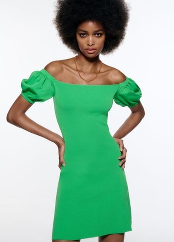 Сукня в рубчик яскравого зеленого кольору, рукава спущені, на резинці