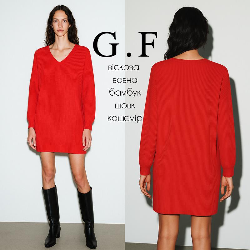 ✨ Красное платье-свитер от G.F. – комфорт, мягкость и шарм минимализма ✨ Свободный оверсайз крой создает расслабленный, современный силуэт. Глубокий V-образный вырез визуально удлиняет шею и добавляет легкости образу. Длинные рукава со спущенной линией плеча подчеркивают стиль непринужденной элегантности. Ребристая фактура придает платья выразительности и визуального объема.. Универсальный размер One Size - идеально садится как на стройных, так и на более женственных фигурах. Приятная на ощупь, мягкая и теплая благодаря натуральному составу: 30% вискоза, 20% шерсть, 20% бамбук, 10% кашемир, 10% шелк, 10% эластан. Длина - 86 см, грудь - 71 см, рукав от горловины - 71 см. Можно носить как платье или как удлиненный свитер в паре с лосинами или узкими джинсами. Состояние — отличный, без каких-либо нюансов. Это универсальная вещь, которая сочетает уют домашнего свитера и утонченность платья, – настоящая база для стильного повседневного образа.