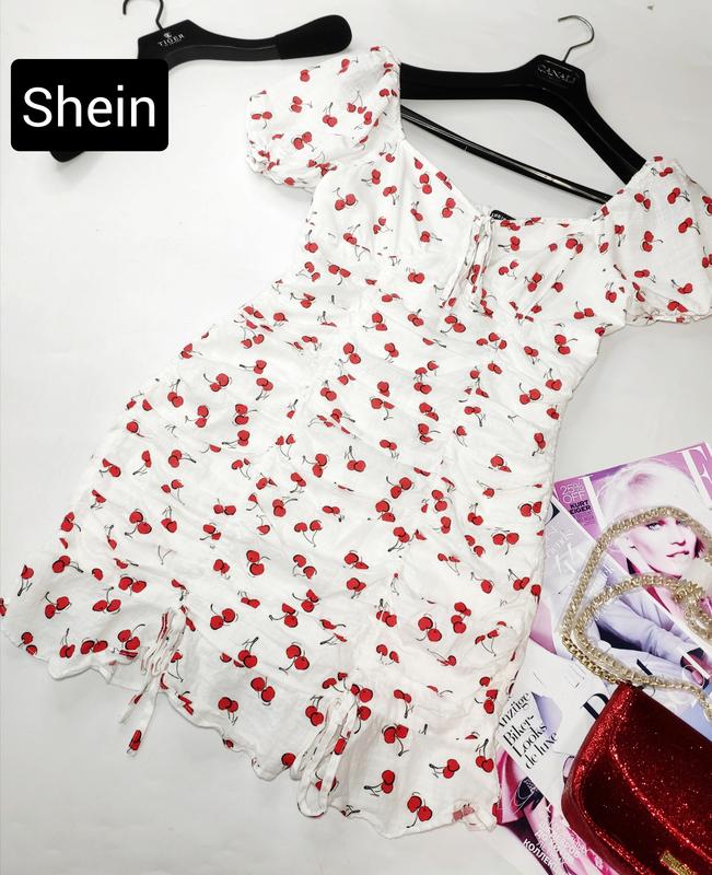 красивое женское платье мини белого цвета в красный принт с вишнями, платье с драпировкой и короткими рукавами фонариками, в идеальном состоянии 😉