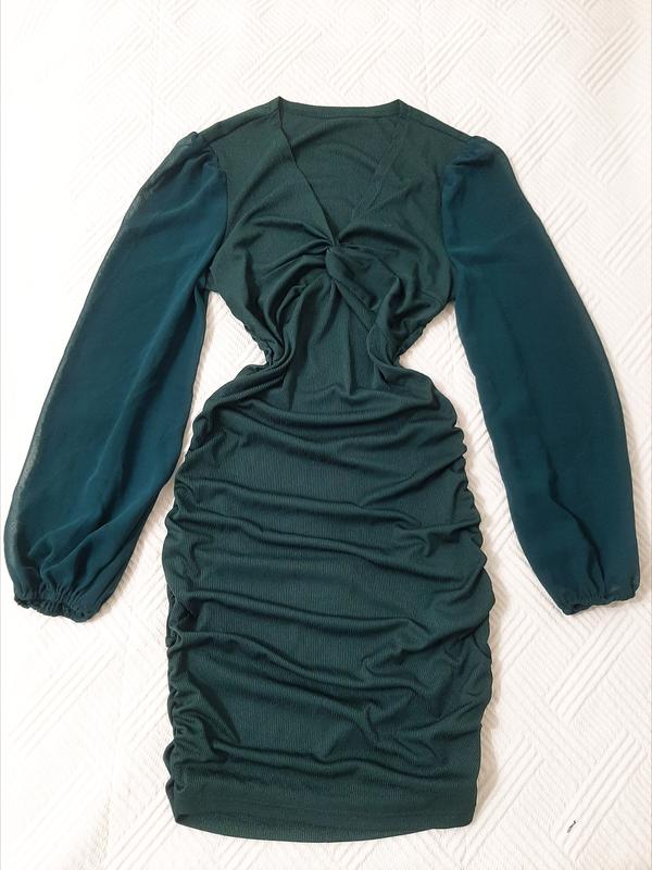Облегающее платье изумрудного цвета с драпировкой с объемными рукавами буфами