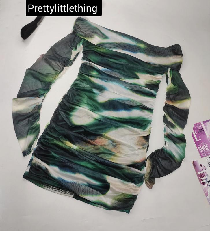 красивое женское платье мини с открытыми плечами, платье с длинными рукавами, сетка, со сборками, зеленого цвета в принт, в идеальном состоянии 😉