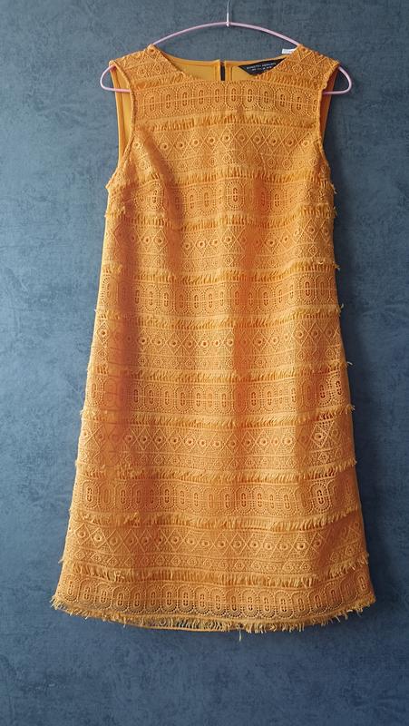 Предлагаю жарко-желтое платье Dorothy Perkins Перед кружево +бахрома на подкладке Спинка -трикотаж Застежка сзади, молния Ткань полиэстр по типу трикотаж Размер указанный 10 Длина 91-92см Плечи 35 см Полуширина в груди 44 см, тянется до 47 см Полуширина в бедрах 49 см