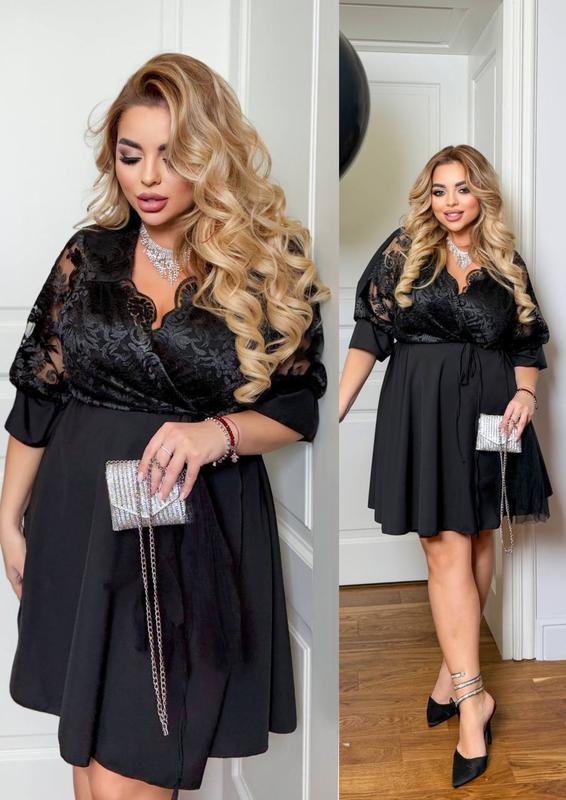 💥Сукня коротка 05705.2 💥Цена 1.045 грн 🔥 Размеры: 48-52, 54-58, 60-64, 66-70 Цвет черный Материал - софт шовк, перед и рукава - дорогое итальянское кружево: вышивка на сетки шелковыми нитями. Длина 98 см, одевается на запах. Юбка - полусолнце, красиво садится по фигуре, не витает, запах регулирует степень приталенности Замеры ⬇️ 💥48-52 - на ОГ 96-105, ОБ до 125 💥54-58- на ОГ 107-118, ОБ до 135 💥60-64 - на ОГ 120- 130, ОБ до 150 💥 66-70- на ОГ 132-142, ОБ до 170