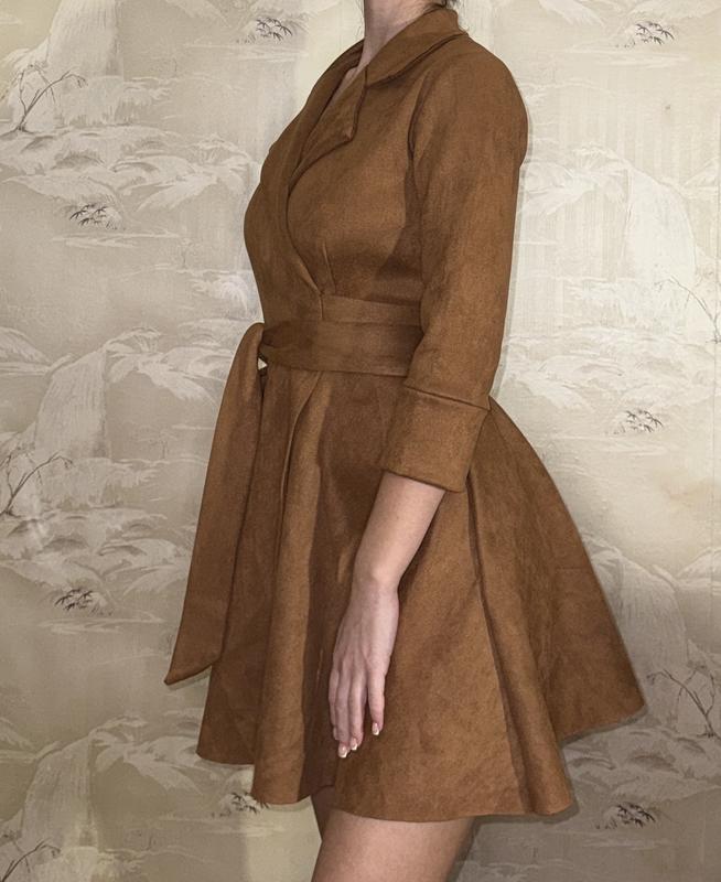 Стильна замшева сукня теплого коричневого відтінку з пишною спідницею «сонечком». В ідеальному стані — вдягалася лише один раз, без жодних слідів носіння. Пояс можна зав’язувати двома способами: бантом ззаду або спереду для підкреслення талії. М’яка на дотик, виглядає дорого та елегантно.