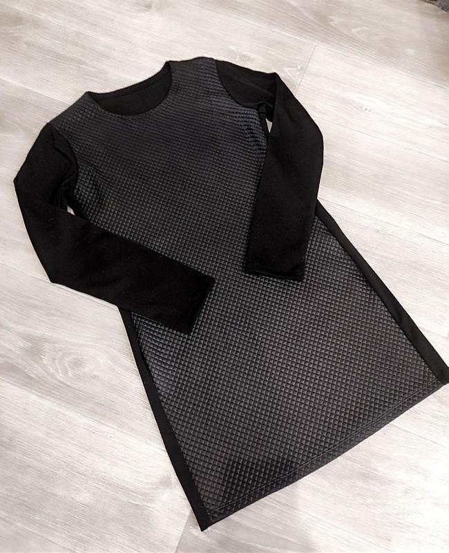 Без дефектів, пошкоджень та недоліків. Тканина спереді імітація шкіри, позаду - утеплений стрейч - тягнеться. Можна носити як туніку під лосини, так і як сукню. Була одягнена двічі. Колір чорний. Крій приталений. Якщо по розміру підійде - буде дуже зручна та комфортна. Розмір 44-46 але дивіться заміри нижче. Заміри: Плечі 37 (напівобхват) Груди 42(напівобхват ) Талія 41 (напівобхват ) Стегна 43(напівобхват ) Рукав 57 Довжина 77