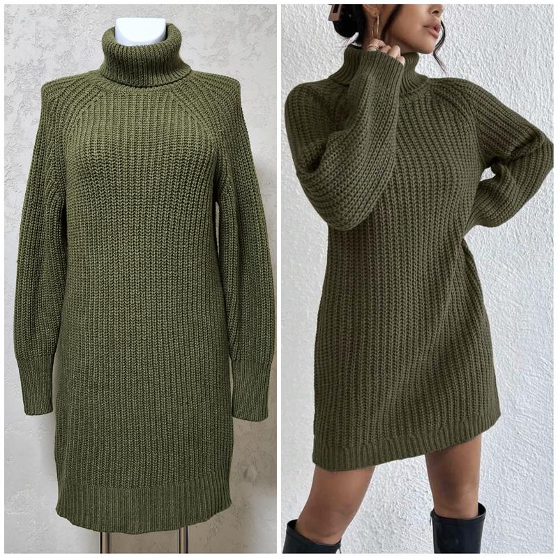 Вязаное платье-свитер Uniqlo цвета хаки, с высоким воротником. Лаконичный фасон дополнен элегантным воротником-хомутом. Приятная к телу плотная акриловая вязка, красиво держит форму и обеспечивает исключительное тепло и комфорт. Идеально подходит для осеннего и зимнего сезона. Удобный прямой силуэт, однотонный дизайн обеспечивают универсальность, позволяя легко сочетать изделие с различными аксессуарами и обувью. 💫 Состояние: идеальный 💫 Размер: XS 💫Состав: 82% акрил, 13% полиэстер, 5% шерсть 💫 Замеры: длина 86, рукава реглан от воротника 74, пог 48-50, низ 50.