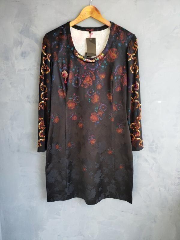 Нова оригінальна сукня aventures des toiles Розмір 40 Ворот розшитий декоративним камінням, на грудях червона брошка. Рукав тонкий, з іншого матеріалу, як дрібна сіточка-капрон. Основна тканина щільна. Заміри: плечі 41 см. груди напівобхват 46 см (тягнеться +5 см) рукав 54 см. талія 40 см. стегна 52 см. довжина 89 см. Aventures des Toiles («пригоди в картинах») - французький бренд, який здобув міжнародну популярність. Одяг марки поєднує у собі твори сучасних художників-імпресіоністів та творчі ідеї дизайнерів та модельєрів. Яскраві елементи картин та палітра кольорів переносяться на тканину у вигляді друку, аплікацій, вишивки, вставок. Ультрамодні, оригінальні та нестандартні візерунки, твори Aventures Des toiles поєднують мистецтво з Prét-à-Porter.