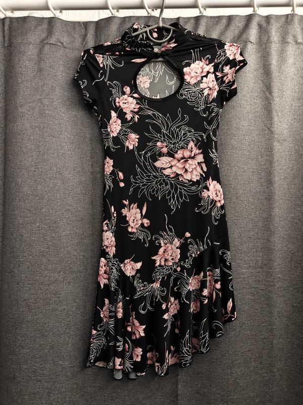 Черное платье в цветок асимметричного кроя, размер S. Цена: 250 грн. Замеры: - длина платья 89 - плечи 32 - талия 30