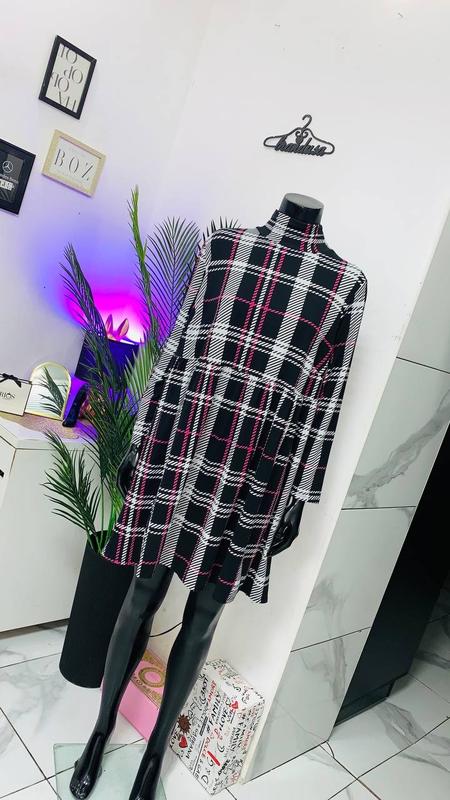 Стиль и комфорт в одном лице! Это яркое мини-платье от Simply Be в смелом сочетании классического принта и современного силуэта. • Дизайн: Платье свободного кроя (baby-doll/трапеция) с высоким воротником-стойкой и длинными рукавами. Свободная юбка с ярусом (рюшей) создает легкий, воздушный объем. • Принт: Эффектный принт в клетку (или гленчек/гусиная лапка) в классических черно-белых тонах, дополненный яркими акцентами в цвете фуксии/розового для современного, трендового вида. • Бренд: Simply Be — британский бренд, специализирующийся на стильной и модной одежде для женщин больших размеров (Plus Size). • Материал: Эластичный и удобный материал из 95% Полиэстера и 5% Эластана, что обеспечивает комфортную посадку и легкость в уходе.
