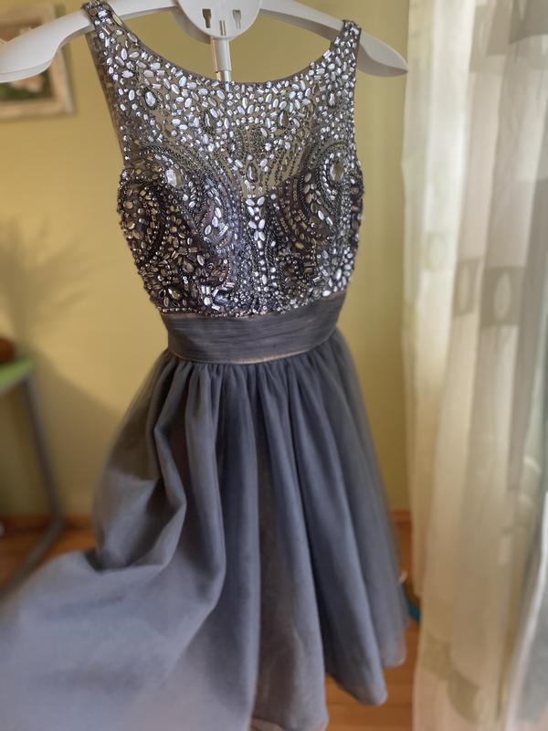 Стан ідеальний — одягалася лише один раз на урочистий захід. Ромір Xs-S - Верх повністю розшитий камінням і паєтками, що красиво блищать при світлі. - Спідниця — легкий багатошаровий фатин, створює ніжний об’єм. - Колір — глибокий сірий з переливом, універсальний і елегантний. - Якісна підкладка, гарна посадка по фігурі. Підійде для випускного, весілля, вечірки чи фотосесії )
