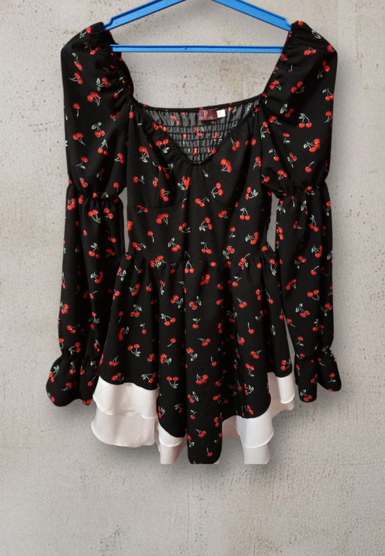 Сукня жіноча,48 розмір Колір: чорний із червоним вишневим принтом М’яка, легка тканина Пишні рукави з еластичними манжетами Розкльошений низ із білою підкладкою для об’єму Комфортна посадка завдяки гумці у зоні декольте