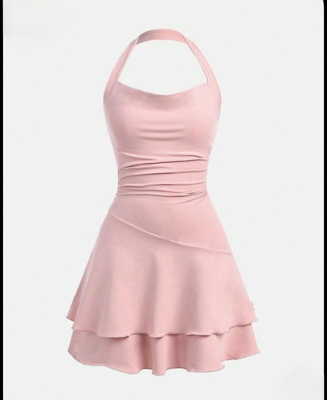 Рожева сукня. Без бірки, не носилась. Модель із відкритими плечима та зручною халтер-бретелькою, м’яко підкреслює фігуру. Спідниця з подвійним воланом гарно тримає форму та створює ніжний, романтичний силует. Матеріал: 94% поліестер, 6% еластан — приємна до тіла, еластична. Розмір: орієнтовно XS-S. Стан: нова, без слідів носіння. Підійде на фото, свята, літо, прогулянки.