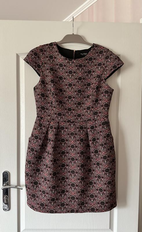 Красивое платье "babydoll" из плотной ткани с объемным рисунком, с кармашками. Сзади молния цвета розовое золото. Эффектно сидит по фигуре. Размер uk 14, eur 42. Длина 90см Рукав 11см ПОГ 48см ПОТ 40см ПОБ 58см Состав: 70% полиэстер 27% хлопок 3% эластан