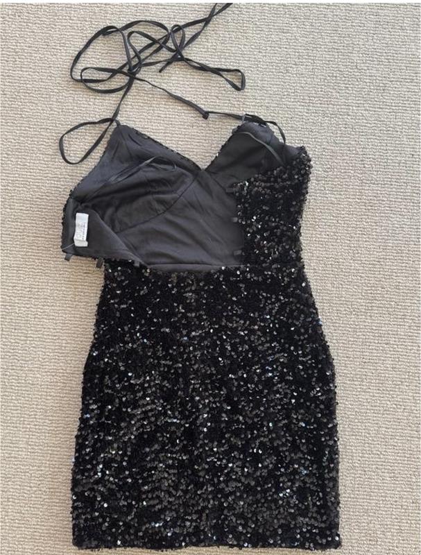 Стильна міні-сукня з відкритою спиною в паєтки. На спині шнурівка якою можна регулювати обʼєм грудей. Заміри: напів обхват стегон - 47, талія - 37, груди не можу точно виміряти, бо спина відкрита і шнурівка по заду. Плюс тканина гарно тягнеться, всі заміри у не натягнутому вигляді. На сукні немає дефектів, так як вона нова. Розмір 12. Вона дуже ефектно виглядає на тілі.