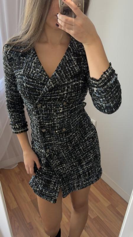 Сукня-піджак твідова чорно-біла, синій. Стильна двобортна сукня фасону піджак з твідової тканини (букле) , злегка приталеного силуету. Модель міні-довжини, ідеально підходить на розмір С