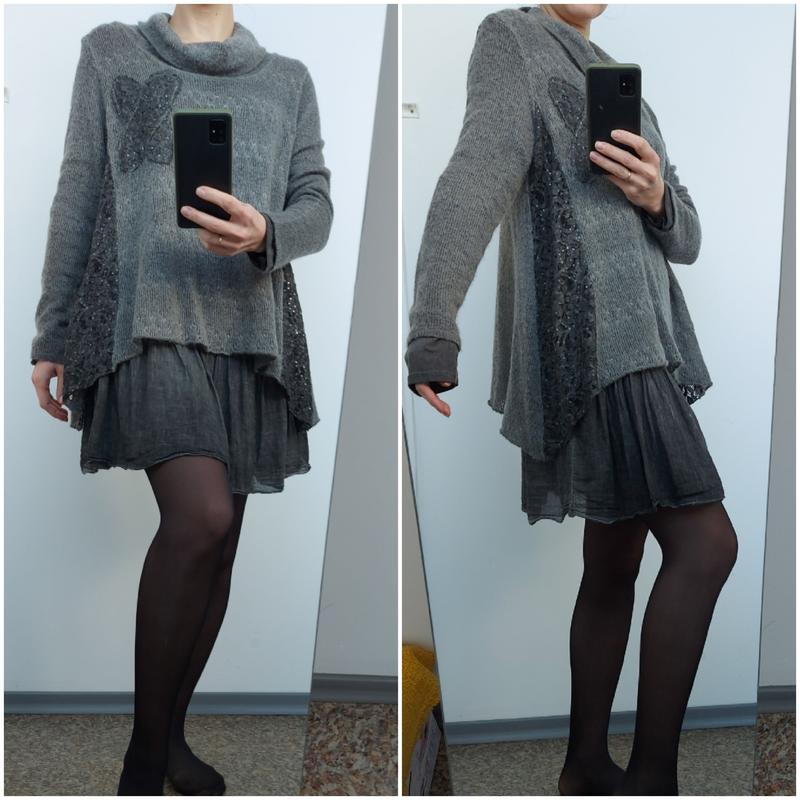 Оригинальная асимметричная туника-платье итальянского производства. Вещь универсальная, можно носить как платье/тунику, можно сочетать с разными брюками или юбками. Верхняя часть снимается и можно носить отдельно как свитер. Верх выполнен из рыхлого трикотажа с большим содержанием шерсти, нижняя часть из хлопка и вискозы, дополнительно декорирована кружевом и лелетками в тон. Длина верхнего слоя 63 (по бокам дольше), нижнего 90, рукав 62, плечи 47, ширина под рукавами 52