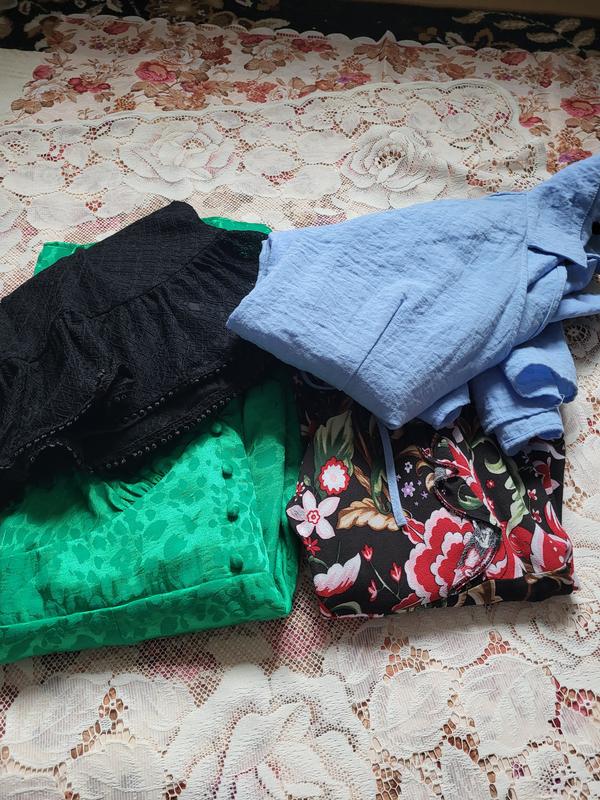 Продам одним пакетом 4 невероятных платья 1. насыщенно зеленая Newlook, позади молея, спереди пуговицы и интересный лиф и широкий рукав, который на запястье стянут резинкой 2. черное кружевное платье H&m с рукавчиком 3/4, есть подкладка 3. интересное цветочное платье Zara, сзади на спинке вставка кружевное, спереди рюши, горловинка хватается на пуговицы на спинке, есть потайная молния 4. голубое платье на запах H&m Размер S Цена указана за 4 шт. и с учетом курса Шкафы Отпрактическая - Укрпочта, Новая почта, Meest, Rozetka